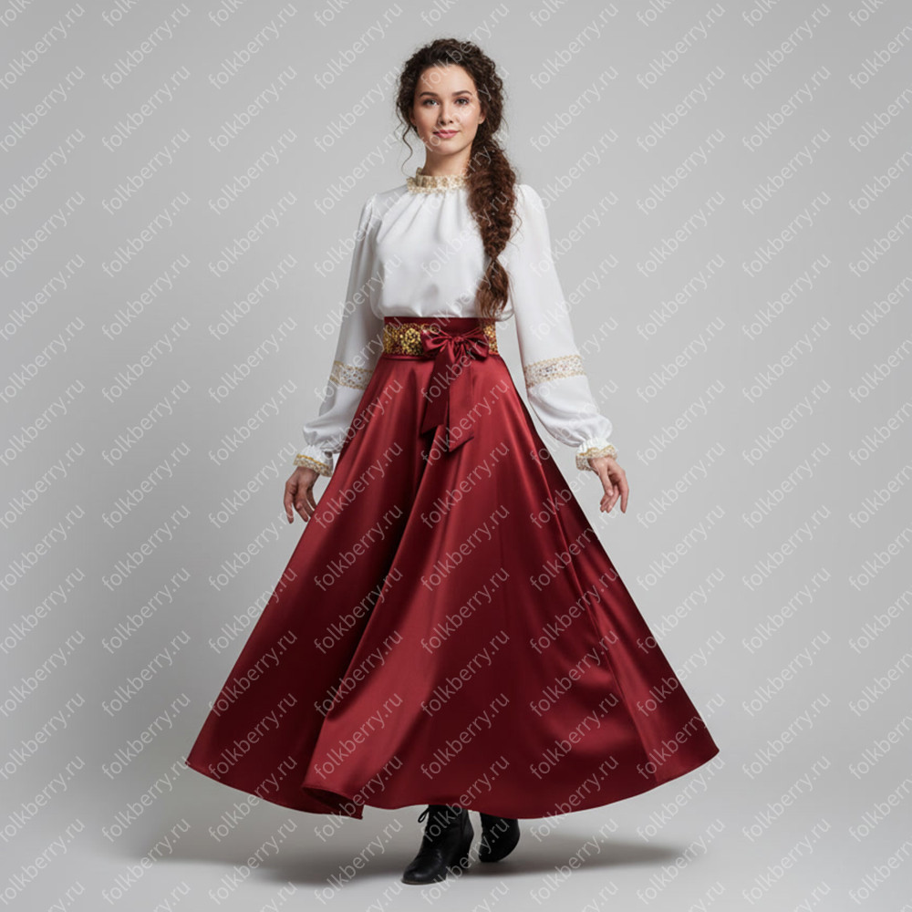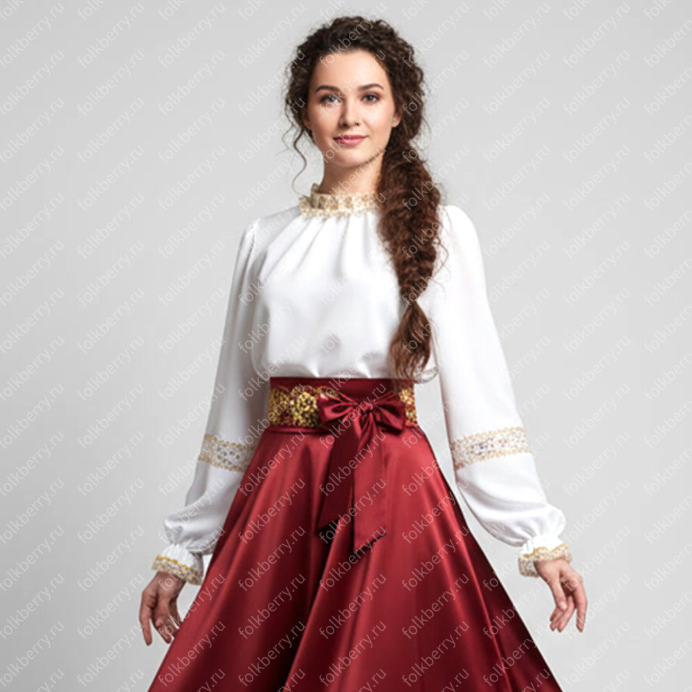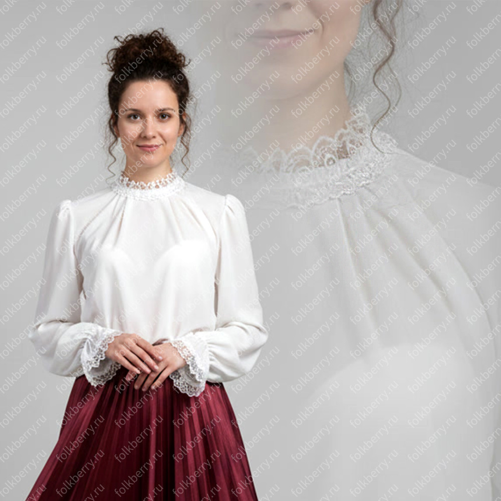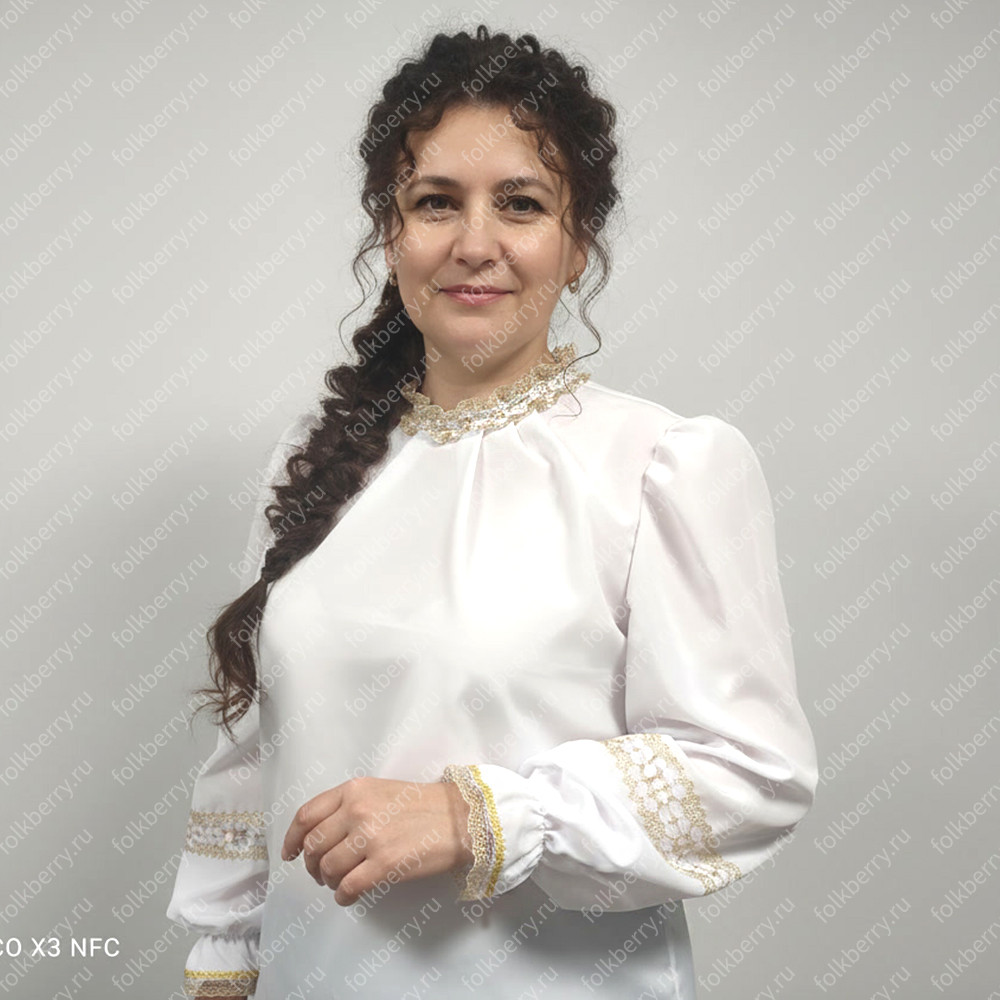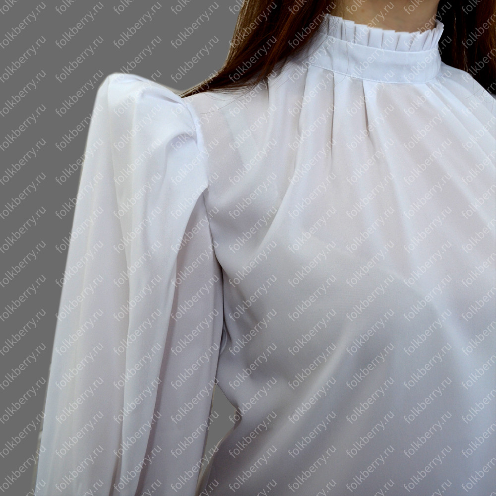 Блуза выполнена из белого шифона. Пышный рукав, по запястью  волан.  Декор золотистого или серебристого цвета.
