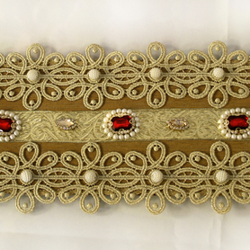 Кокошник выполнен из бархата (или атласа, на Ваш выбор), бусин белого и золотого цвета, пайеток, жаккардовой тесьмы, контрастной по цвету к фону.