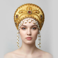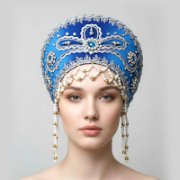Кокошник выполнен на твёрдой основе, ткань – атлас (креп сатин), декорирован вьюном, тесьмой «завиток», а так же бусами, пайетками, и бисером, которые пришиты вручную. Высота изделия составляет над головой 12,5 см, ширина 27 см. Сзади кокошник крепится резинкой и атласной лентой, которая завязывается в бант. Возможно корпоративные сочетания цветов и нанесение Вашего логотипа.