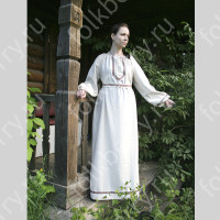 Костюм выполнен из парчи бело-серебристого цвета. Костюм декорирован искусственным мехом белого цвета. Застежка - потайные кнопки. Силуэт - приталенный, сзади кулиска для регулировки талии. Красивый пышный рукав. Отделка - серебристая ажурная тесьма. Длина шубки по спинке 93-98 см (от седьмого шейного позвонка до низа изделия).