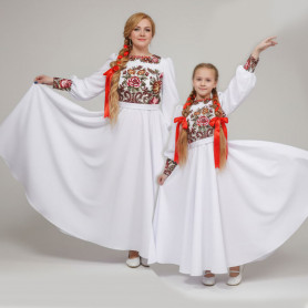 Выполненный в православном стиле сарафан с блузой «Русь» сшит из натурального хлопка в цветочек. Модель скромно декорирована однотонным воланом в цвет с основной тканью и тесьмой вьюнок. Можно носить под пояс и регулировать бретели по длине. Белая блузка из хлопка с длинным рукавом расшита натуральным нежным кружевом.