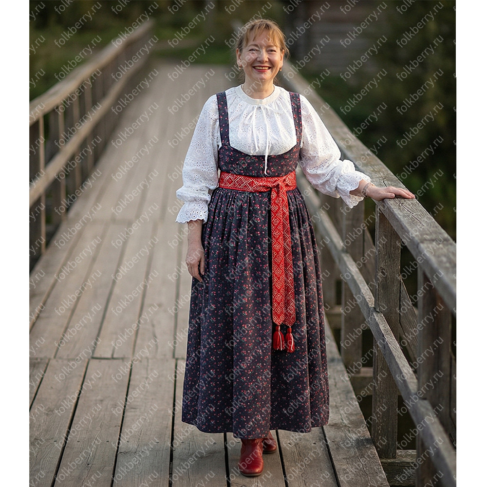 Сарафан: 100% хлопок с историческим синим цветочным принтом восстановленным на Шуйском ткацком производстве;