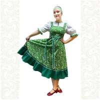 Выполненный в православном стиле сарафан с блузой «Русь» сшит из натурального хлопка в цветочек. Модель скромно декорирована однотонным воланом в цвет с основной тканью и тесьмой вьюнок. Можно носить под пояс и регулировать бретели по длине. Белая блузка из хлопка с длинным рукавом расшита натуральным нежным кружевом.