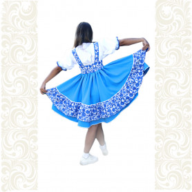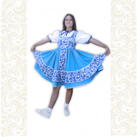 Сарафан сшит из хлопка ( большие размеры из габардина) светло-голубого цвета. Длина – 130 см, бретели регулируются. Наряд украшен жаккардовой тесьмой и «вьюнком».