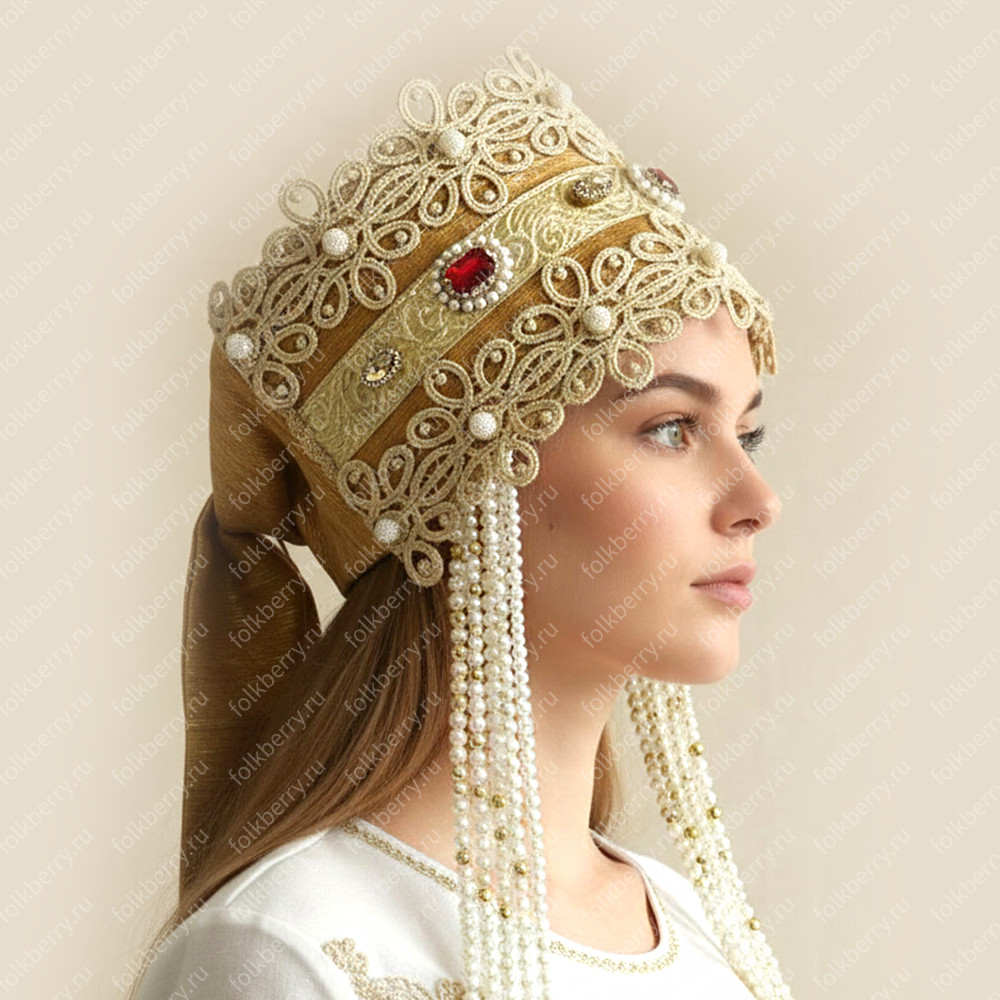 3. Кокошник выполнен из парчи, кружева, страз. К кокошнику прилагаются полупрозрачная фата и длинные бусы-подвески. Высота кокошника 13 см. Сзади ленты-крылья. Кокошник легкий и удобный.